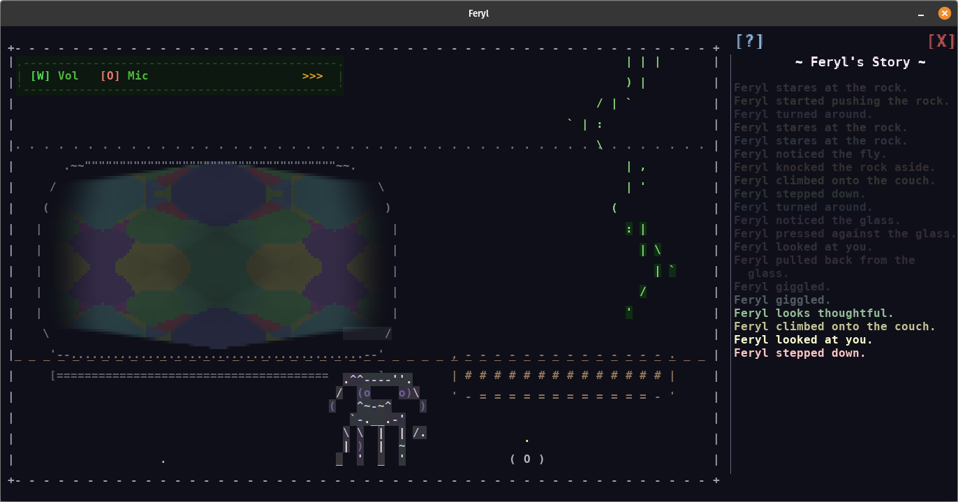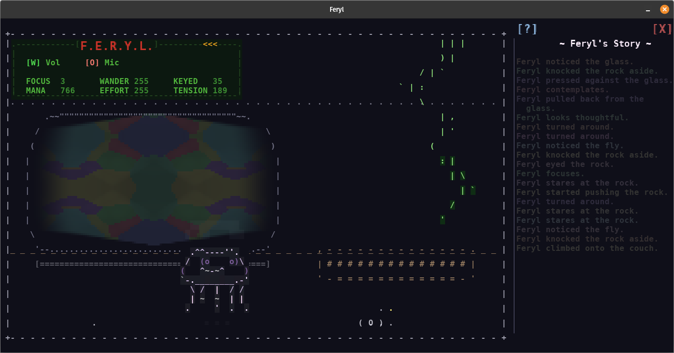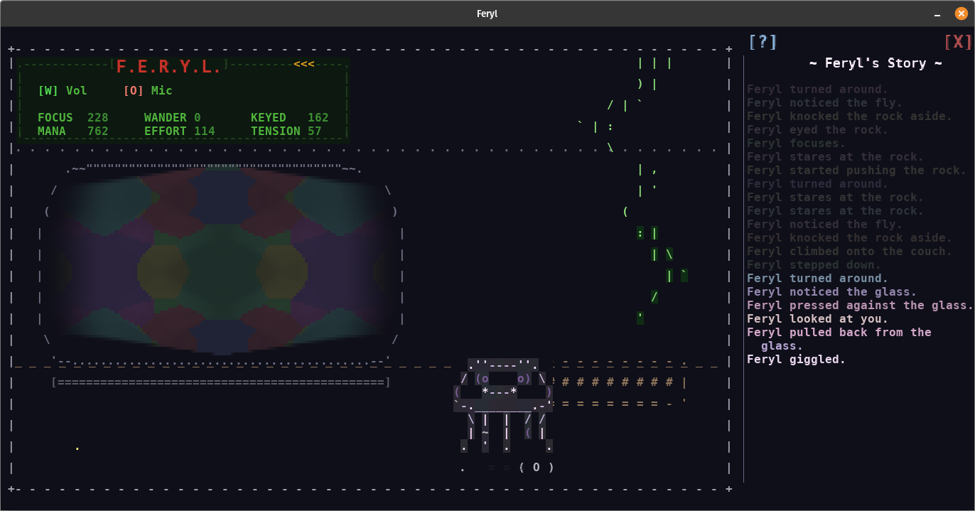 Feryl is a small creature in a glass terrarium on your desktop. It breathes on a 170-tick cycle — inhale, process, exhale, rest — and everything it does is timed to that breath. Where it looks, when it moves, whether it cares about the rock or the fly or the glass or you.